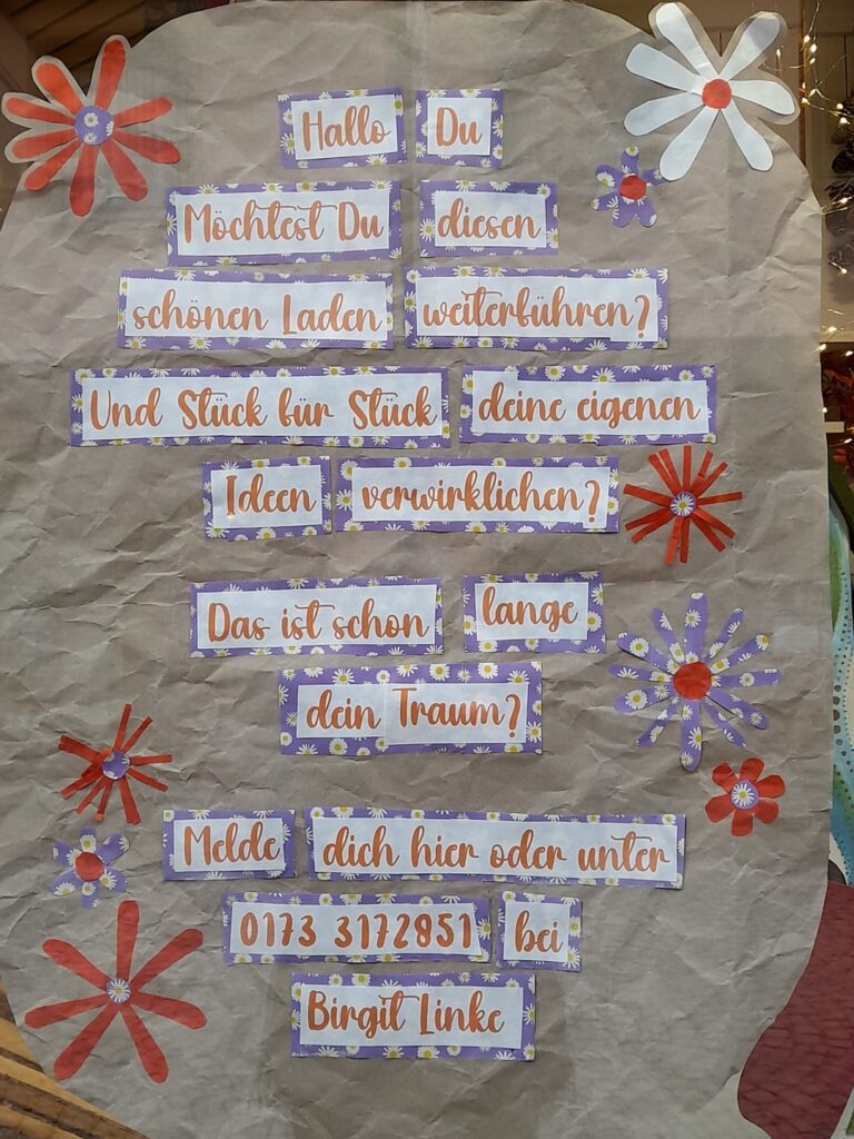 Also suchen wir jetzt jemanden, die/der an solch einer Geschäfts-Übernahme interessiert wäre. Auch Nachfolger, die ein ganz eigenes Konzept umsetzen wollen, sind willkommen. Bitte weitersagen.